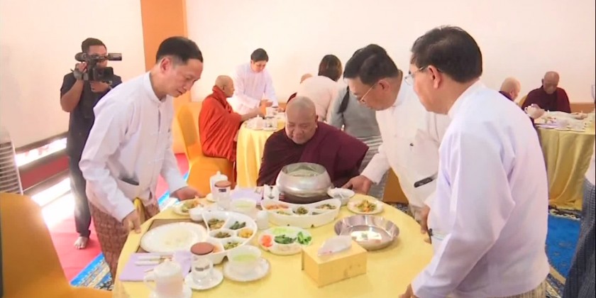 This was followed by offering of donated offertories to the Sayadaws by the Joint Secretary of SAC, SAC members, Union Ministers and congregation. They then took a sermon delivered by the Thanlyin Min KyaungSayadaw and shared merits gained.