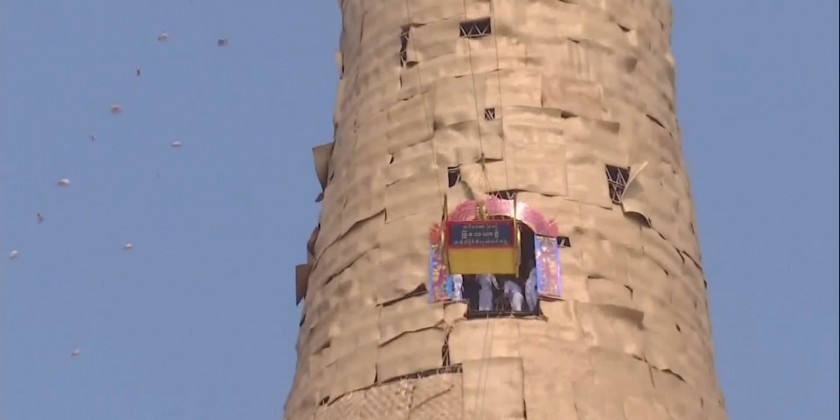 At the auspicious time, the Prime Minister and party conveyed the jewel diamond orb and the pennant-shaped vane by the decorated float atop the pagoda, and sprinkled scented water on them. At the same time, officials conveyed the jewel diamond orbs atop the encircled stupas.