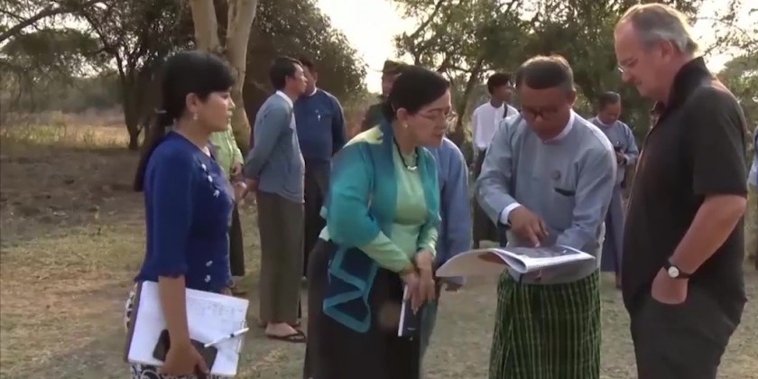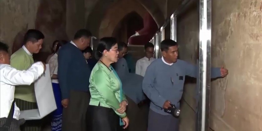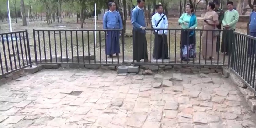 Next, they visited the dredging site of ShweHtee Lake, Shwe Nan Yin Taw Lakes (1, 2 and 3), PhooThuTaw Lake and MyaukTaWat Lake. They also observed the lightning rod installation on Pagoda No-748 (Sularmani pagoda), fixing process of Tempered Glass for preservation of murals in the tunnel, paving a brick floor circuit between the plinth and the outer wall and completion status of the original floor display booth.