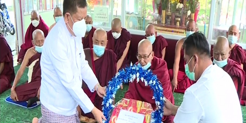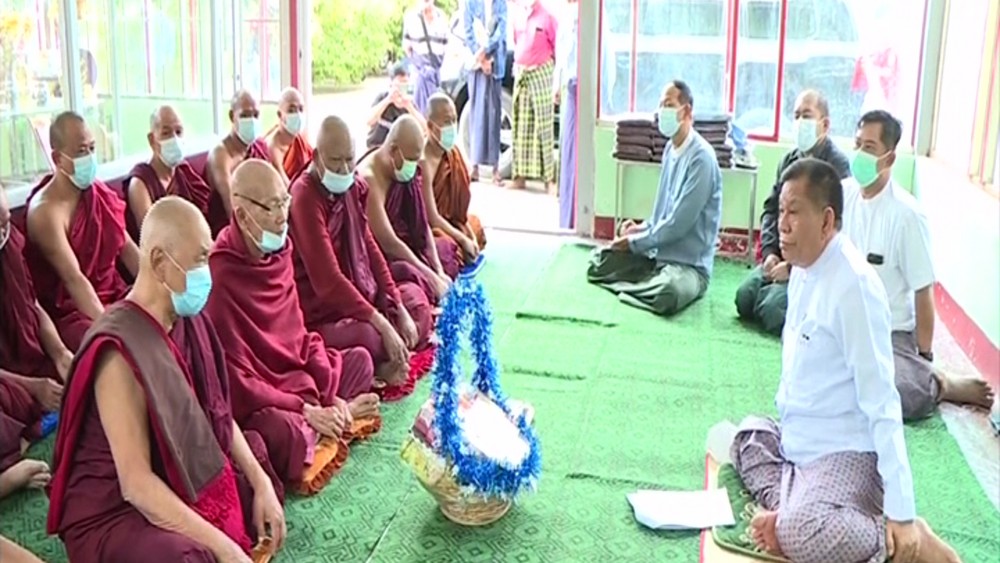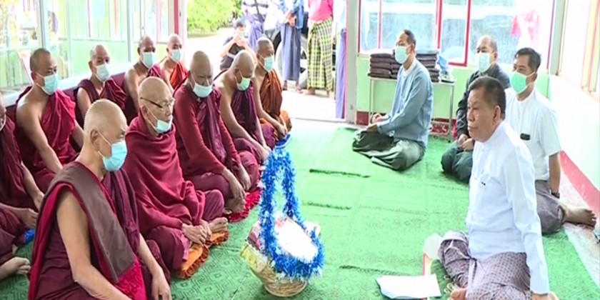 First, the chief minister reported the instructions of the Chairman of the State Administration Council Prime Minister regading renovation and conservation of Myanmar cultural works and ancient buildings and religious edifices, providing four essential needs of the Sangha and healthcare and giving vaccination to the members of Sangha.