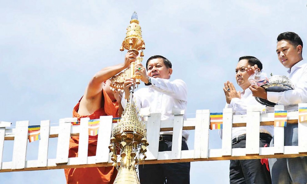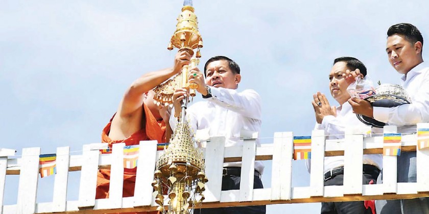 In the ceremony, the Senior General and party hoisted the diamond bud, vane and golden umbrella atop the replica of Shwedagon Pagoda. They also sprinkled scented water on the diamond bud, vane and golden umbrella. T