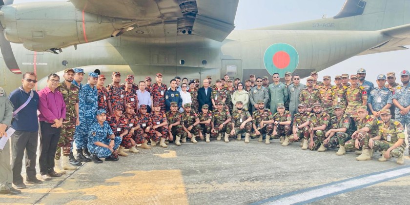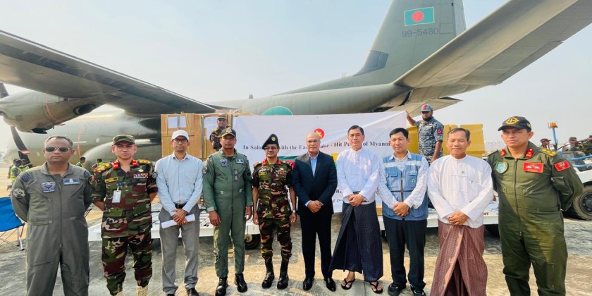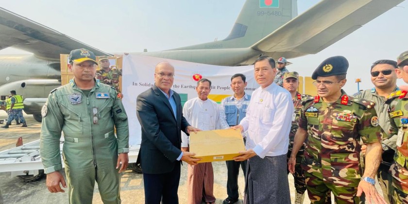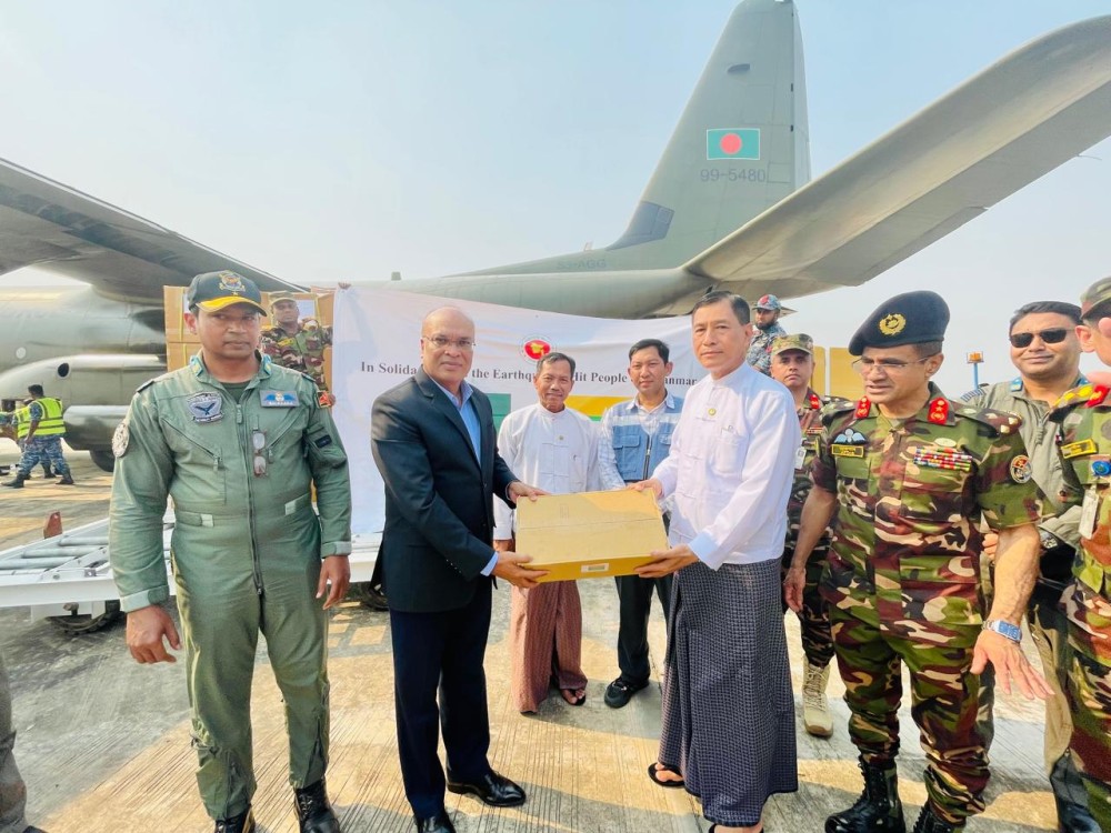 Two C 130 J and one CASA C 295W flights carried the team along with a total 15 metric tons of relief materials comprising 4.2 metric ton medicine and medical products, tent, and dry food. Ambassador of Bangladesh Dr. M Monwar Hossain handed over the relief materials to Ambassador at large of Myanmar Foreign Ministry U Kyaw Tun. Earlier on 30 March, Bangladesh sent the first consignment of 16.5 metric tons of relief in 2 flights.