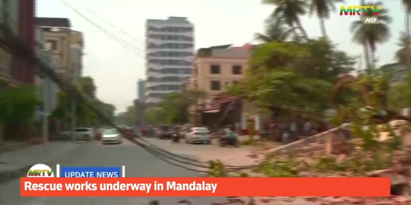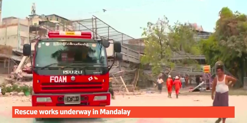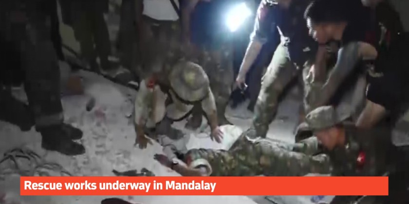 Yan Myo Aung, Auxiliary Fire Brigade member said "Since yesterday, we started fire extinguishing measures in Chan Aye Thazi Township. Then we continued with the rescue works at the sites of collapse buildings. We were fortunate to save one life amidst the wreckage."