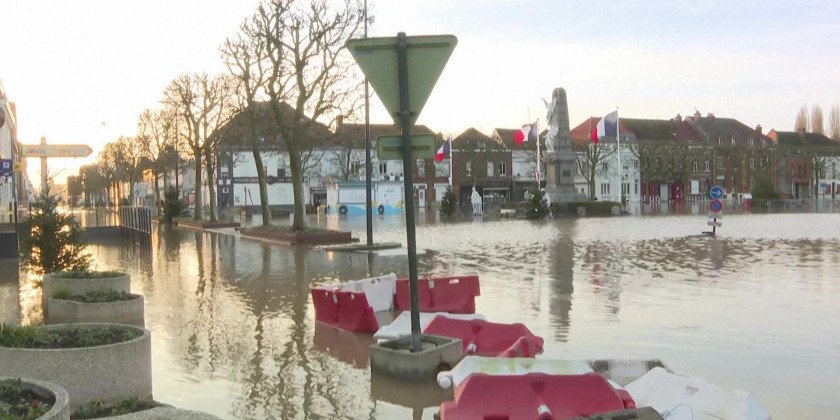 Residents of Arques in northern France get around the town's flooded streets with the help of tractors ahead of a visit by French Environment Minister Christophe Bechu on Thursday.