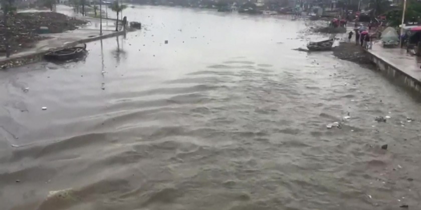 The storm also flooded a power plant and caused a bridge to collapse, leaving one community isolated. In one town, people waded through waist-deep water as they tried to rescue belongings including a motorcycle. Some families grabbed each other by the hand as they battled floodwaters flowing through streets while balancing large bags of clothes and other items on their heads.