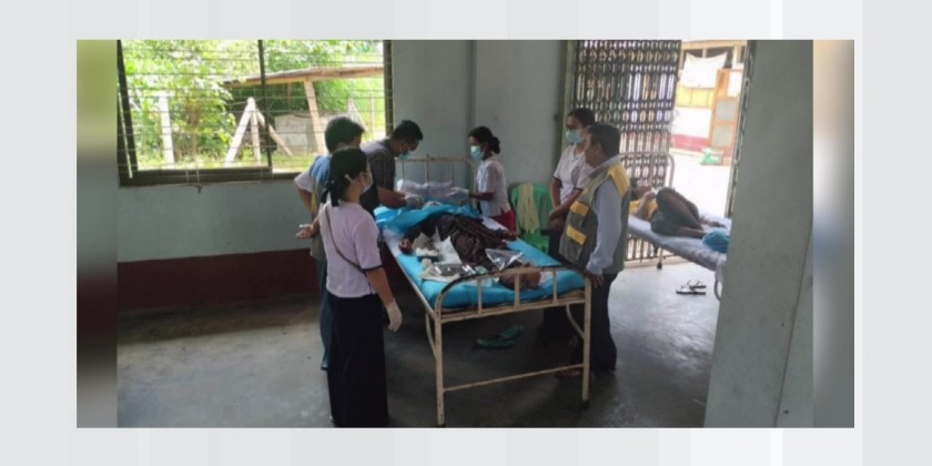 As per the Prime Minister's second directive, the 25-bed Naungcho Township People’s Hospital, which was destroyed by terrorist insurgents, is being urgently repaired to restore its original condition and resume regular healthcare services. While the hospital is undergoing repairs, a temporary hospital has been set up at the Myanan Tawwin Mingalar Hall, where the Tatmadaw and the Ministry of Health are jointly providing medical treatment.
