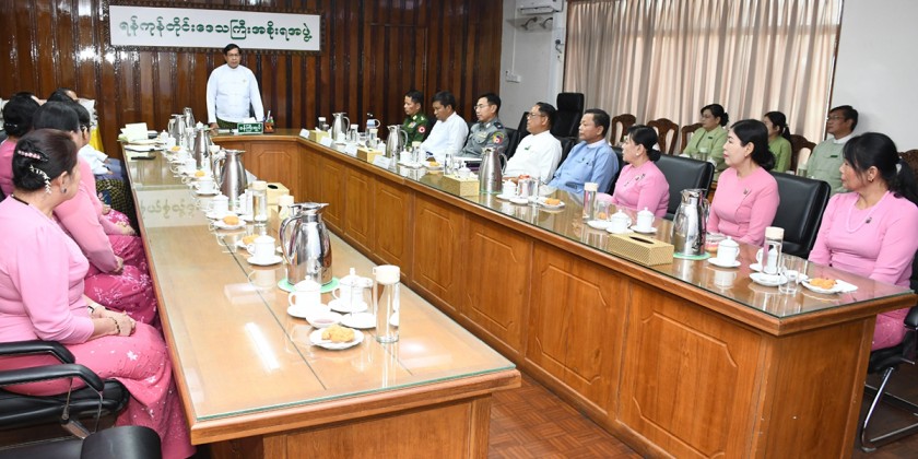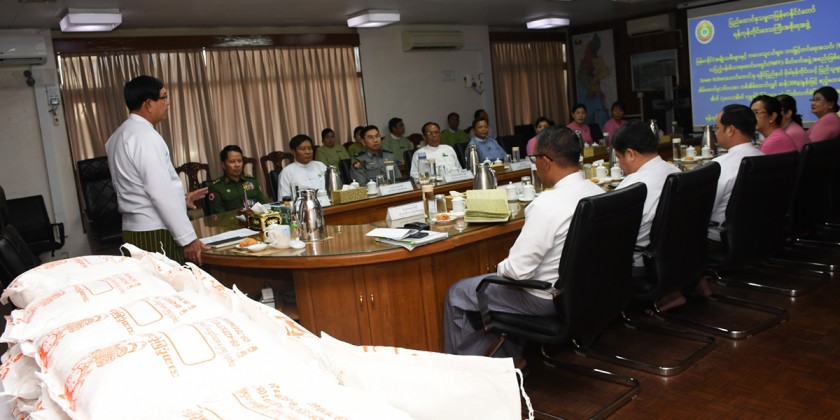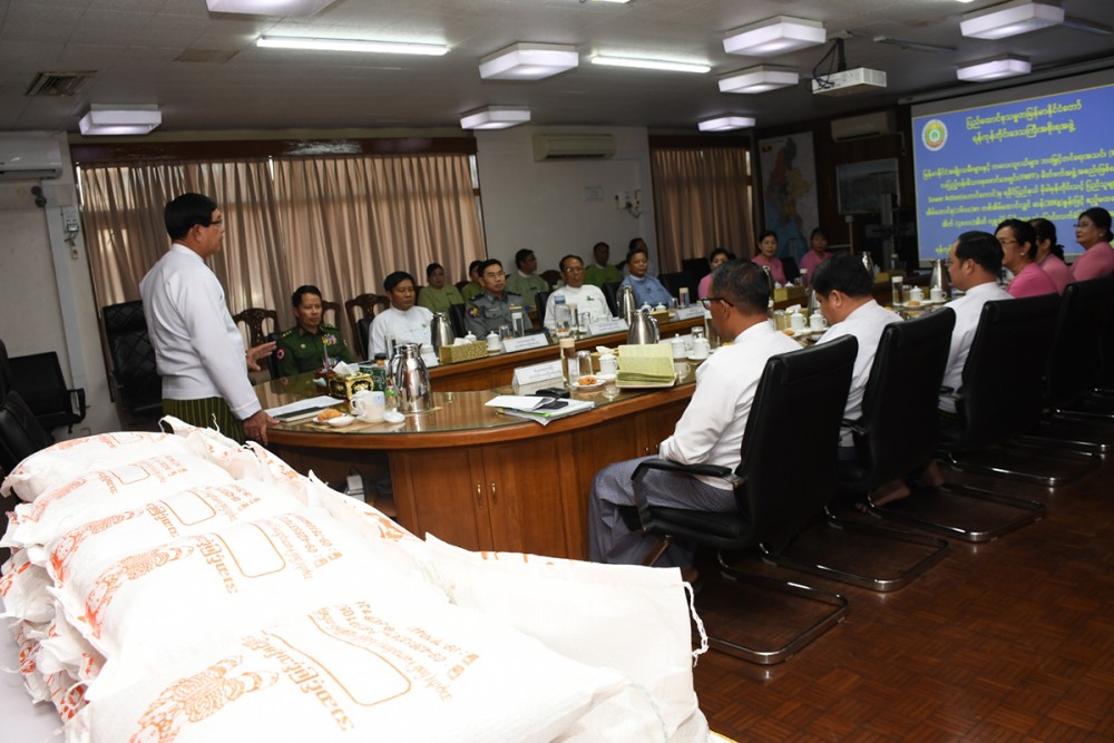 The ceremony of donating rice bags and handing over by the donors of Myanmar Women and Children Development Foundation, Full Moon Family Foundation and partner organization Sower Action (Hongkong) for the Mocha Cyclonic Storm affected people in Rakhine State was held at the meeting hall of Yangon Region Government on 19th December.