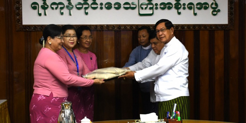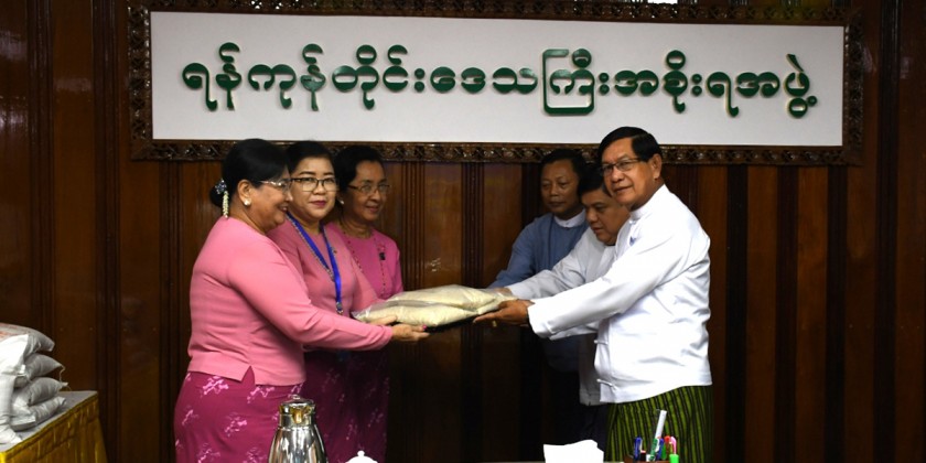 Next, a responsible person of Myanmar Women and Children Development Foundation clarified the purpose of the donation. Then, 4800 (10 Kg) bags of rice for 1600 households with 30 Kg per household were donated to the National Disaster Management Committee and Yangon Region Chief Minister U Soe Thein (on behalf of the committee) accepted the donation and returned the certificate of honor.