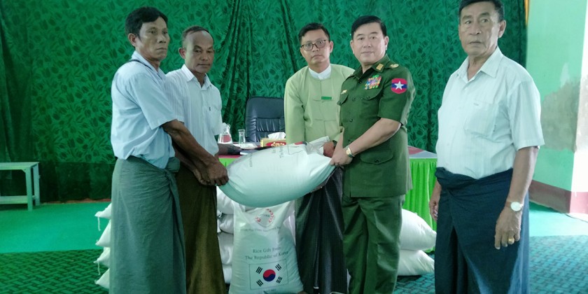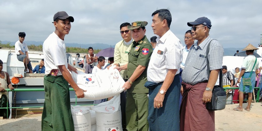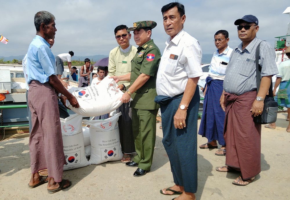 Major General Aung Myo Tun, currently in Rakhine State for rehabilitation tasks, and Chairman of the Rathedaung Township Administration Department U Naing Lin Htet and departmental officials attended the rice donation ceremony for the cyclone affected people in the Township at the Rathedaung port on Thursday.