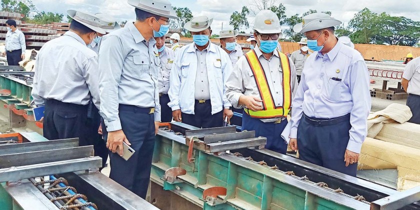 The union minister arrived at Gyaing (Kawkareik) Bridge construction site and inspected the preparations of bridge piles, construction of bridge approaches and new technology f precast works. Then, the union minister inspected the laying the asphalt-concrete in Eindu-Pha An  Road section and instructed to address keeping the set standards in laying asphalt-concrete.