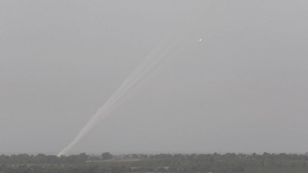 A salvage of rockets is fired from the southern Gaza Strip towards Israel. The Israeli army said it bombed scores of targets in the Gaza Strip as diplomats pressed on with efforts to halt the fighting that Hamas says has killed 20,000 people in the Palestinian territory.