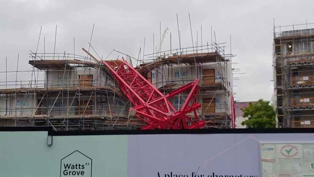 The 20-metre crane fell onto a site where flats were being constructed and two adjacent terraced houses, the London Fire Brigade said. Two of the injured were treated for head injuries and were taken to hospital and the other two patients were assessed at the scene, the London Ambulance service said.