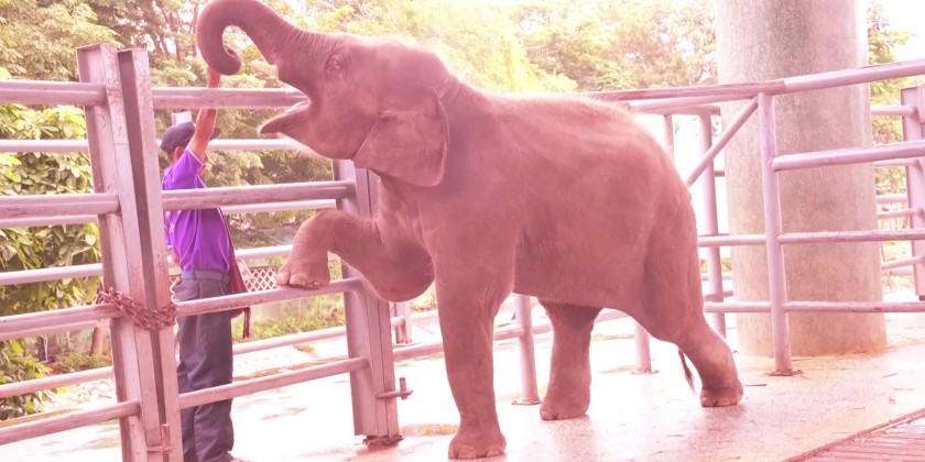 Now, the royal white elephant “RahtaNandaka” turns two year and 3 years old and his height becomes 5 feet and 3 inches, 8 feet in girth and about 1573 pounds. He lives together with his mother happily. As he is a white elephant who has been tame with people since he was young, he is being trained by the “Peace Human and Elephant Interaction Training” to become more familiar.