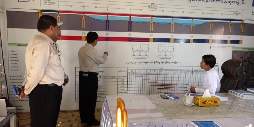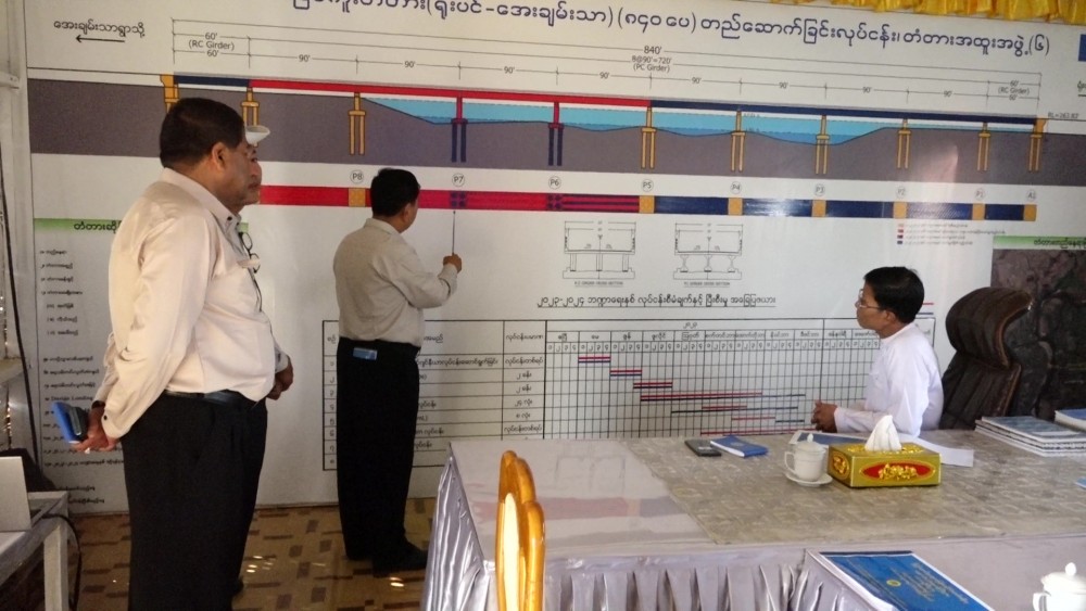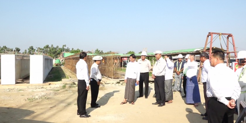 Deputy Ministry for Cooperatives and Rural Development U Myint Soe along with officials concerned inspected the construction of 840 feet long Yone Pin-Aye Chan Thar Bridge with the budgets of the Nay Pyi Taw Council and the Ministry in Yone Pin village of Lewei Township in Nay Pyi Taw Council Area on Friday.