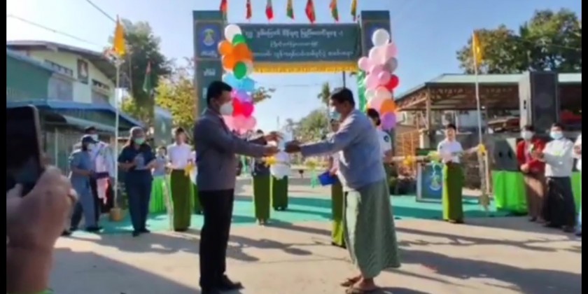 The Chief Minister and party then attended Anawrahta concrete road opening ceremony and presented commemorative gifts to officials. Anawrahta road is the major road of Eainme and it links the east to the west of the town.
