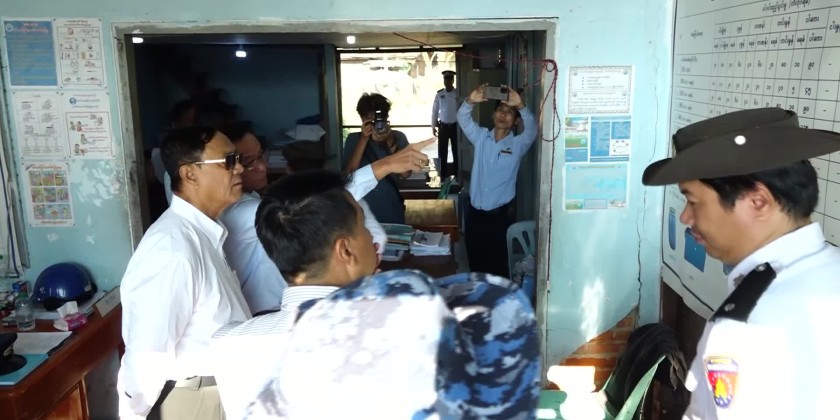 First, Union Minster and party visited F.O.B camp in ShweHintha Ward and oversaw the operation process of import/export check point by the inspection teams and inspected the cooperative office.