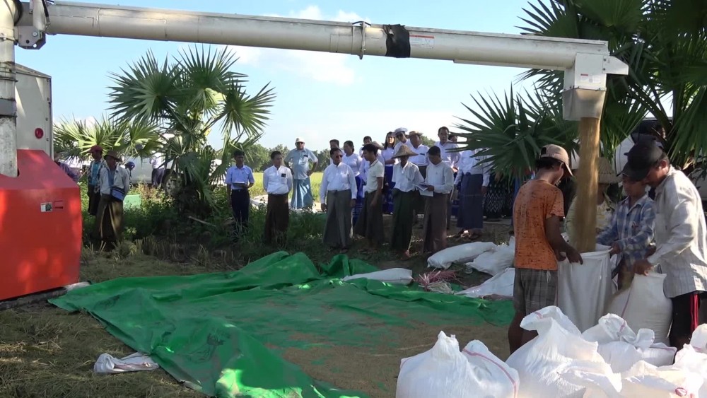 Union Minister for Cooperatives and Rural Development U Hla Moe together with the concerned officials inspected harvesting processes of monsoon paddy at Tha Htay Gone Village of Pyinmana Township on Friday.