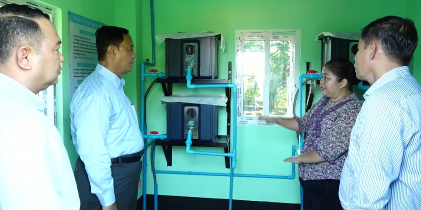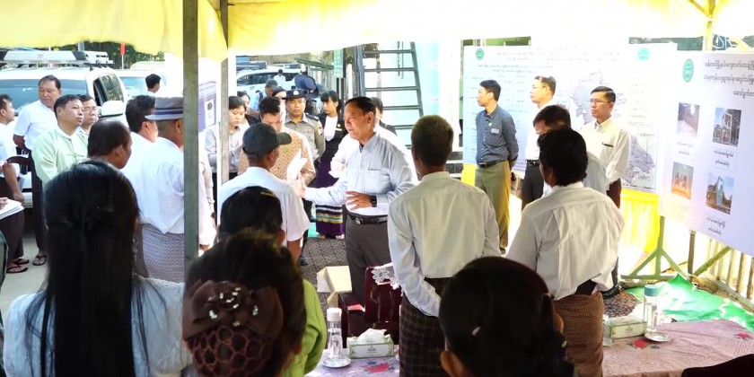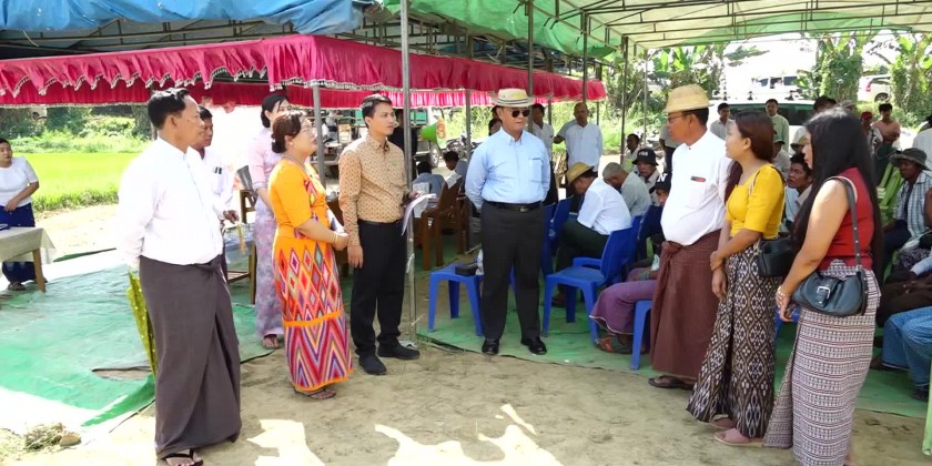 Union Minister for Cooperatives and Rural Development U Hla Moe accompanied by many other concerned officials visited Atwin Thel Phyu Village of Htan Ta Pin Township on Sunday and heard reports on regional development processes in the Township as per the fiscal year and water purification system in the Village.