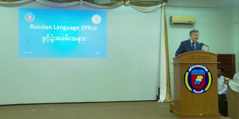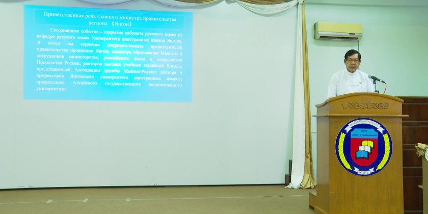 Chief Minister U Soe Thein delivered a welcoming speech, stating that learning the Russian language well and having the opportunity to study Russian culture will further strengthen the friendship between Russia and Myanmar. He expressed his wish for Russian language majors to seize these opportunities, strive to achieve master's and Ph.D. degrees, and become brilliant citizens who can dutifully serve their nation. He extended his special thanks to Altai State Pedagogical University of Russia for establishing the Russian Language Office at Yangon University of Foreign Languages and for offering short-term courses to Russian language students.