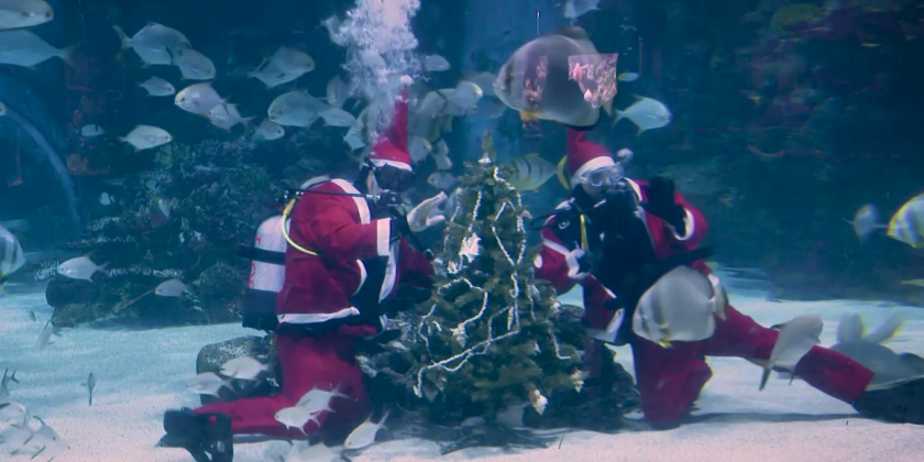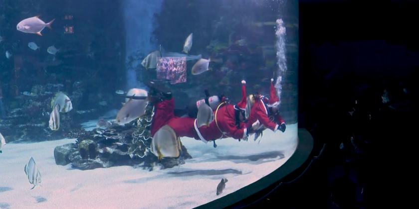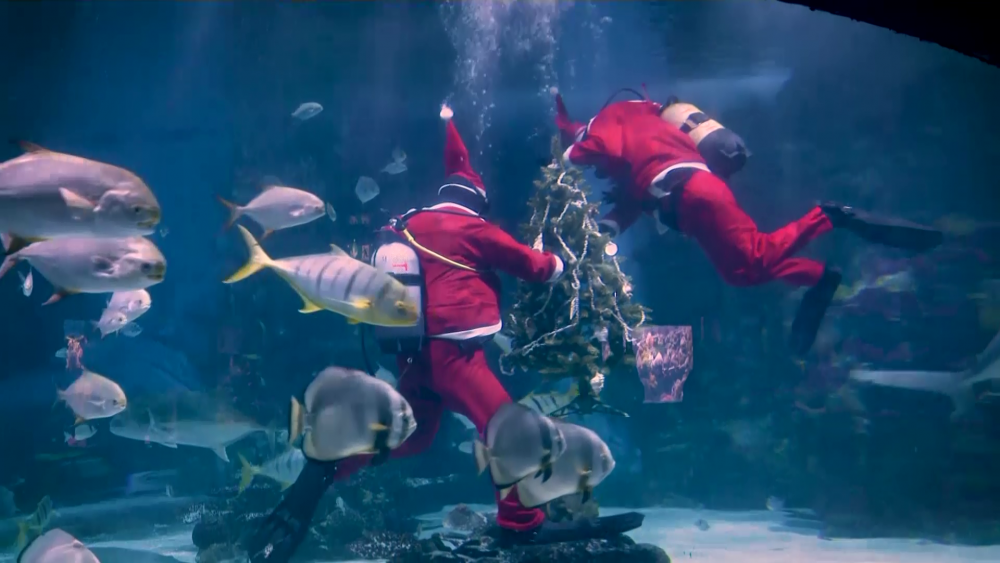 An annual holiday event, the Christmas tree decoration takes place in an underwater tank where visitors can see the two divers dressed as Santa among the aquarium's aquatic life. The water tank holds 1 million litres of saltwater and the tank is home to eight sharks and other sea creatures.