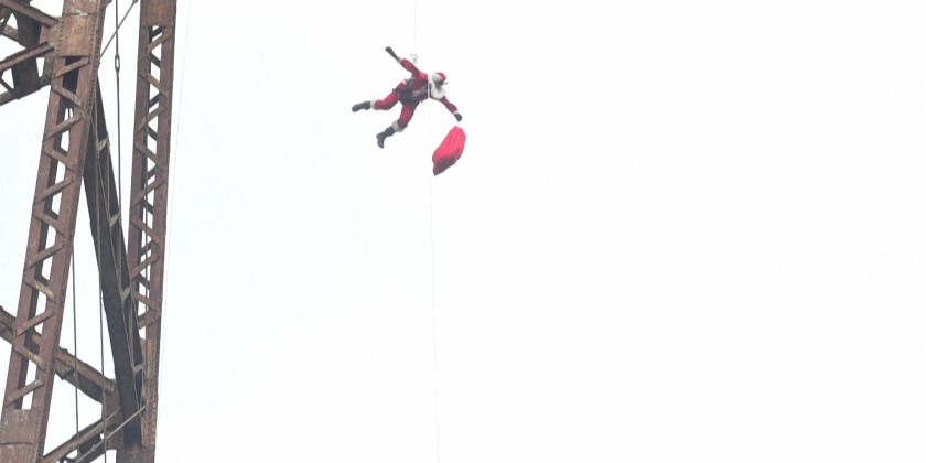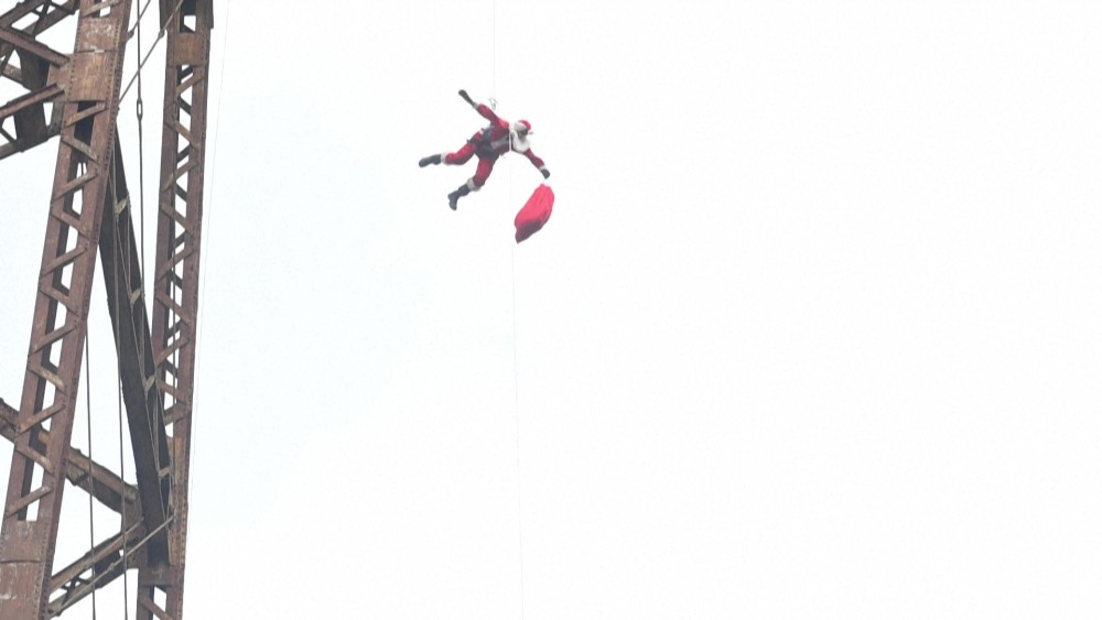 Tied with ropes, a veteran firefighter dressed as 'Santa Claus' rappels down from a 75-meter bridge in the capital of Guatemala to deliver presents to children from low-income families, a Christmas tradition started 26 years ago.
