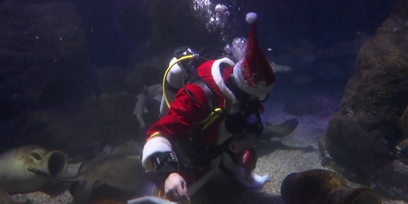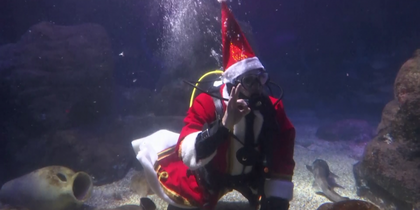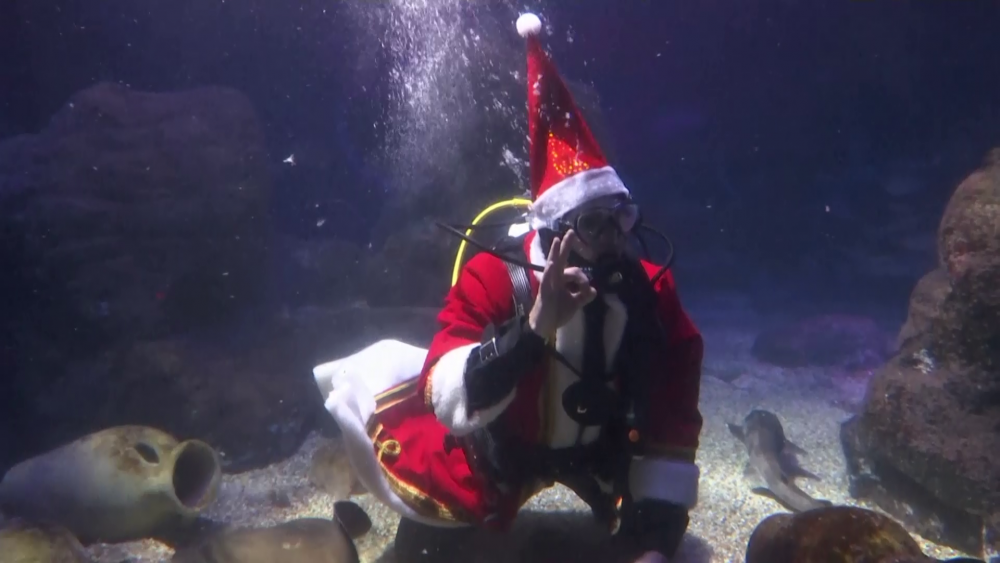 Stingrays, sharks and other fishy residents of an aquarium in Germany had a very special visitor to mark St Nicholas Day on Monday. A diver wearing the traditional long red coat of Santa Claus and a sack of goodies snorkeled in the underwater world of SeaLife Berlin, giving fish some snacks and treats.