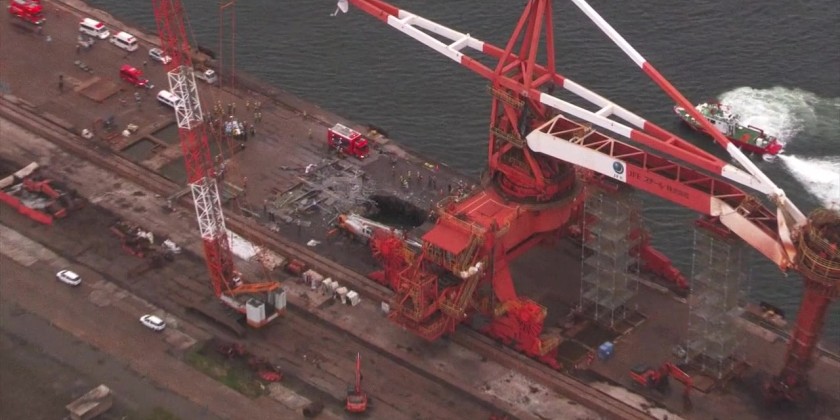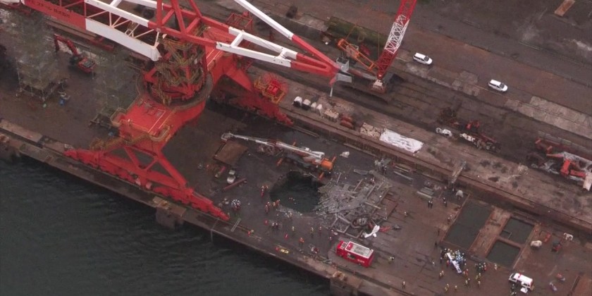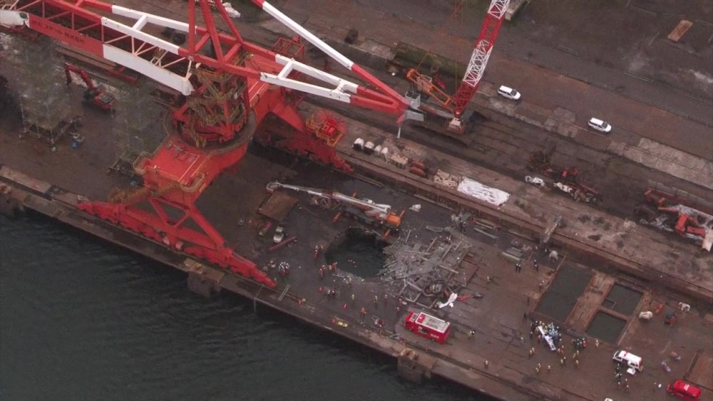 Three people have been seriously injured after scaffolding about 40 meters high collapsed at a steel mill in Kawasaki City, near Tokyo. Police suspect the accident was caused by the impact of a 500-ton weight that came off a crane. The incident occurred on Tuesday evening at a construction site of JFE Steel's East Japan Works in Keihin District. Police are also investigating whether there were any problems with the safety management of the work.