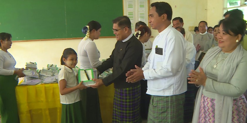 State chief minister, chief justice of state high Court, State ministers and State education officers presented textbooks and exercise books to the middle and high school students provided by the Ministry of Education and presented cash of honor to the school band and cheerleaders team. The students concluded the ceremony by singing “World Class Education’ song.