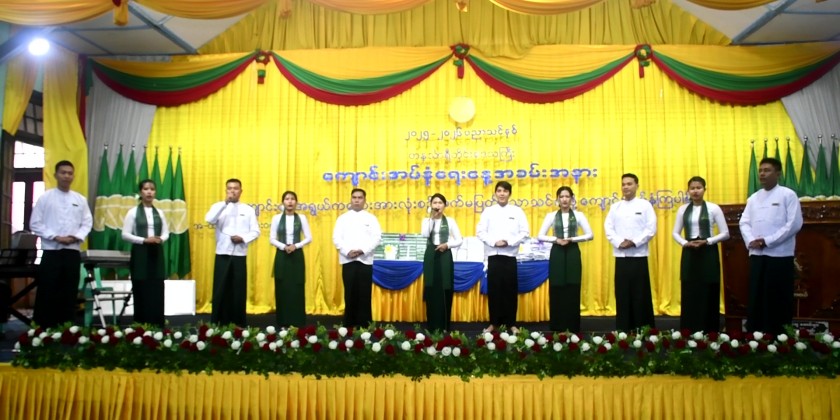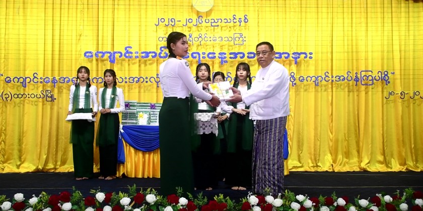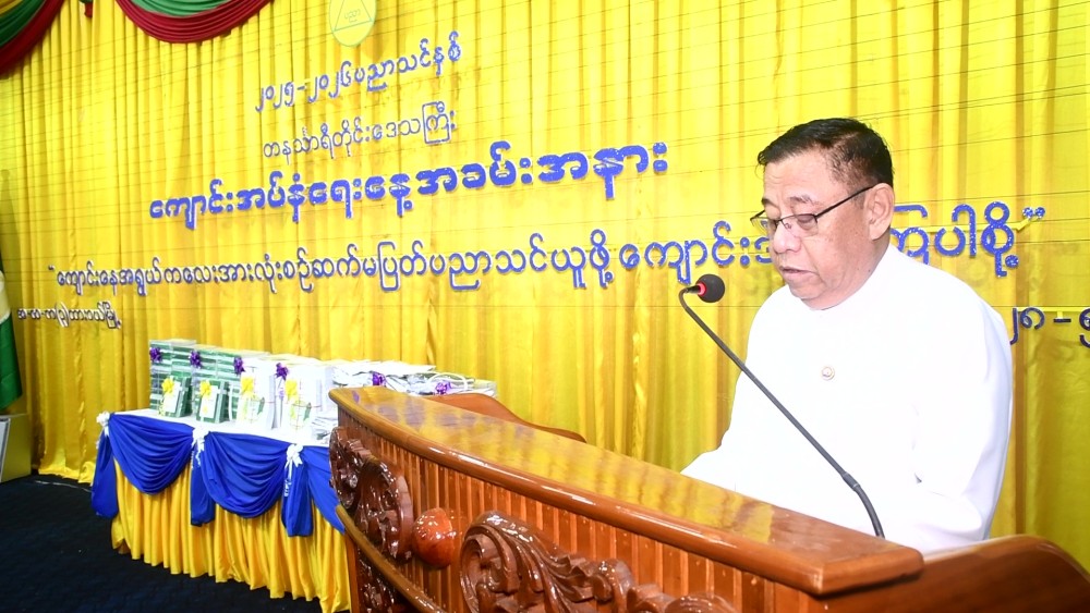 Following this, the Regional Director of Education, U Win Naung, gave a detailed presentation on the enrollment process. Then, the Chief Minister, the Chief Justice of the Region High Court, and the Region Minister for Security and Border Affairs jointly distributed school materials, including printed textbooks and blank exercise books for the primary, middle, and high school levels, as well as school uniforms for primary students.