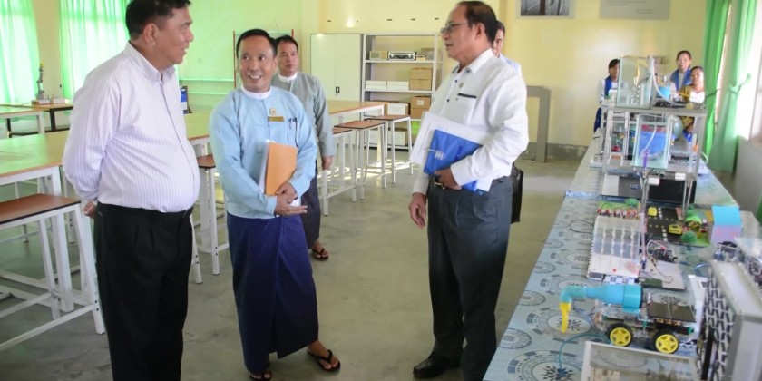 Union Minister for Science and Technology Dr. Myo Thein Kyaw visited Myitkyina Computer University, Government Technological High School (Myitkyina), and Technological University (Myitkyina) on November 14. He met with teachers and staff, encouraging them to continue producing skilled and well-rounded students who can contribute to regional development.