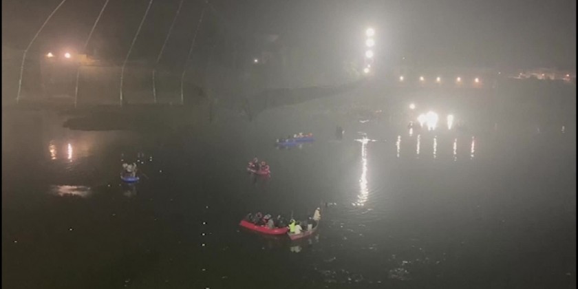 They scoured the dark waters for survivors, but were seen recovering a number of bodies instead. At least 132 people died and many were injured when the cable suspension bridge over the Machchu river collapsed on Sunday evening.