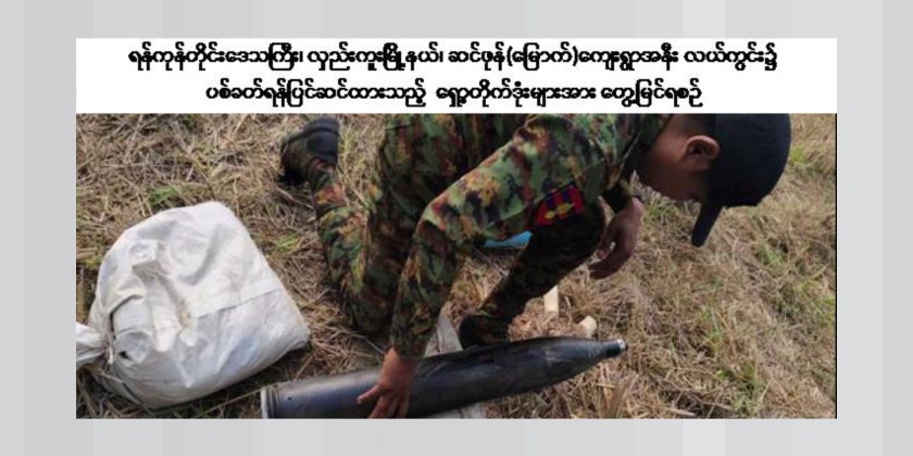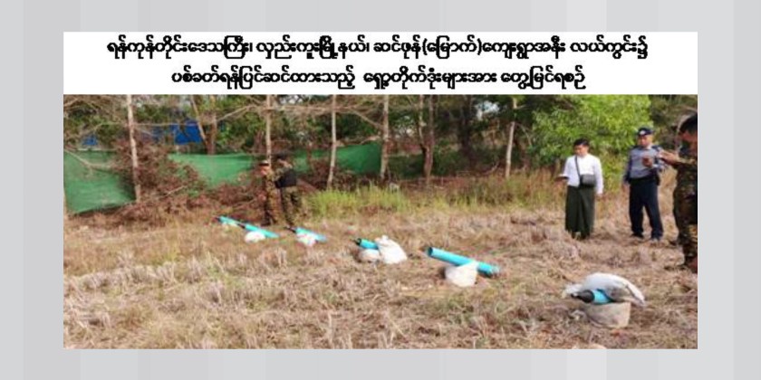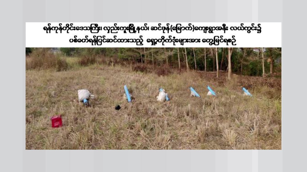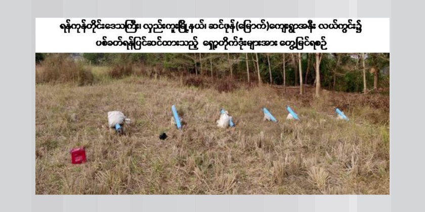 Six pipe bombs prepared by PDF terrorists were discovered in a field near Sinphon (North) Village in Hlegu Township of Yangon Region, at around 6:30 am on Saturday. Local security forces safely neutralized the explosives to protect the public. Investigations and area clearance are ongoing. Citizens are advised to report any suspicious activities to prevent danger.