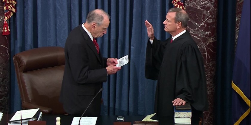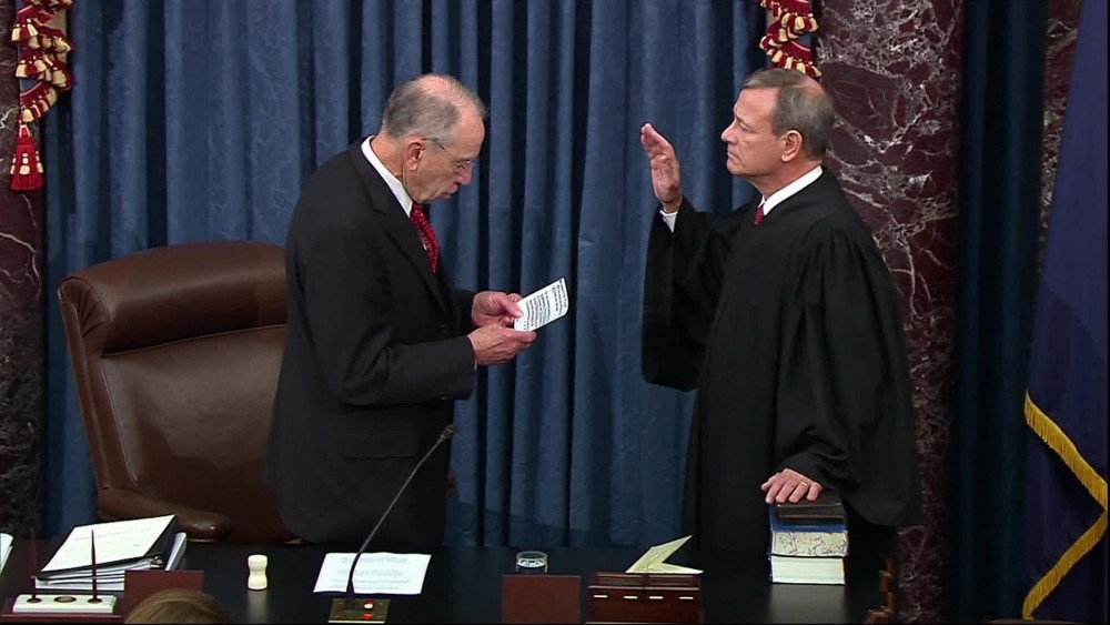 The chief justice of the United States was sworn in Thursday to preside over President Donald Trump's impeachment trial, then immediately swore in the entire Senate body in turn with an oath to ensure "impartial justice" as jurors for only the third such proceeding in American history.