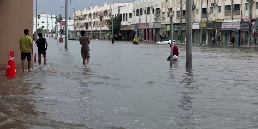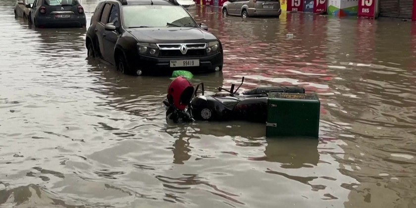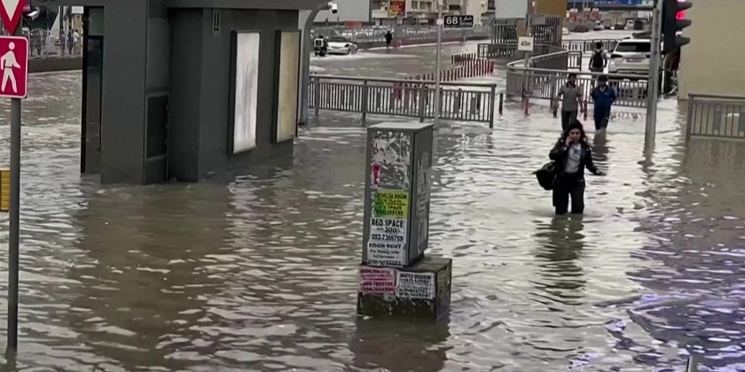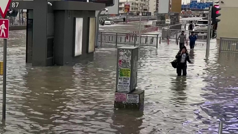 Vehicles and pedestrians make their way through flooded streets in the Emirati city of Sharjah as heavy rainfall sweeps across the desert country.