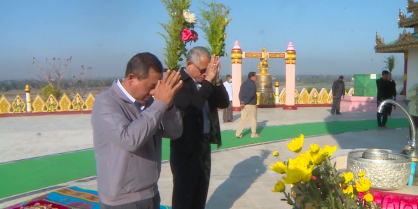 First, the SAC members U Jeng Phang Naw Taung, U Sai Lone Sai, U Maung Har and U Shwe Kyein, Union Ministers, Kachin State Chief Minister, Commander of Northern Command, deputy ministers, senior Tatmadaw officers, chief justice of state high court and state ministers visited Yahandar TaHtaung Shin Pin Myat Swer Wishes Fulfilling Pagoda located on the Shwe Moe Hill near the bank of Ayeyarwady River in Mai Nar Village of Wai Maw Township.