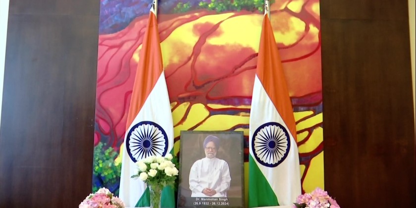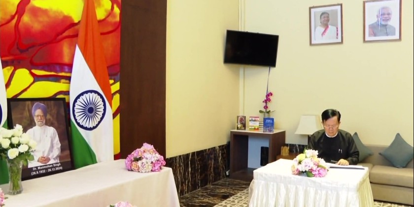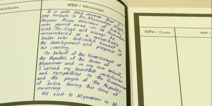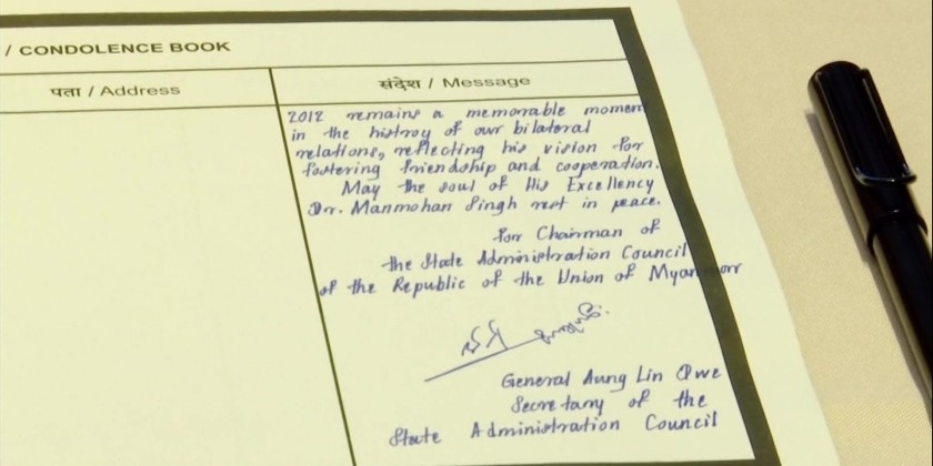 On behalf of the Chairman of the State Administration Council, General Aung Lin Dwe, the Secretary of the State Administration Council, accompanied by officials from the Ministry of Foreign Affairs, arrived at the Embassy of India Liaison Office, situated at the Park Royal Hotel, Dekhina Thiri Township, Nay Pyi Taw at 12 pm on 30th December to sign the book of condolence for the passing of Dr. Manmohan Singh, former Prime Minister of the Republic of India, who passed away on 26 December 2024.