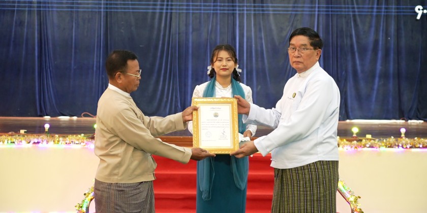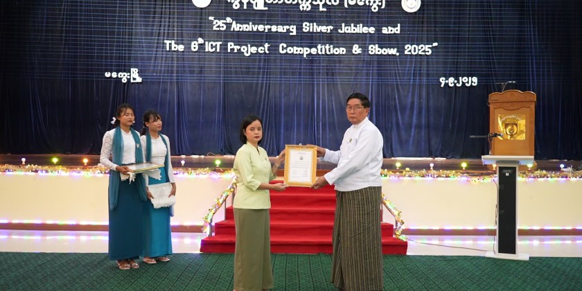Next, Dr. Myo Min Than, Pro-Rector of the UCS (Magway), provided an explanation of the 25th-anniversary event and the 6th ICT Project Competition. Chief Minister U Tint Lwin then presented certificates of honor to the organizations and alumni who supported the Silver Jubilee celebration.