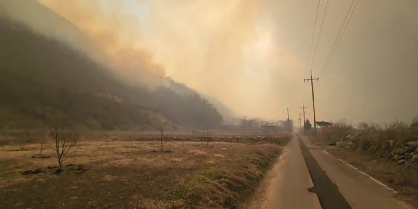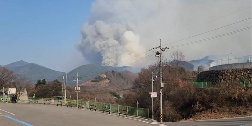 Strong winds fan the already devastating fire. The wildfire at Uiseong, Gyeongsangbuk-do Province was started accidentally by a visitor at around 11 a.m. on March 22nd. Around 1,500 residents of nearby villages are forced to evacuate.