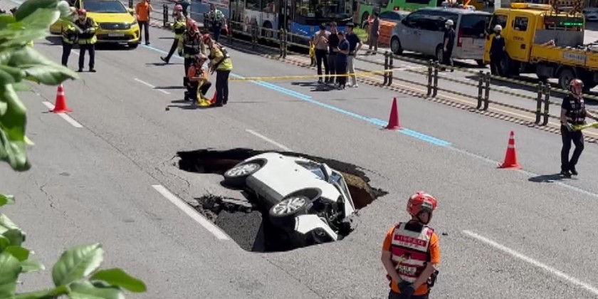 A sinkhole on Thursday opened up in the middle of four-lane street in Seodaemun-gu District in Seoul and swallowed a car. The accident left the driver in his 80s seriously injured. The passenger in her 70s was also hurt.
