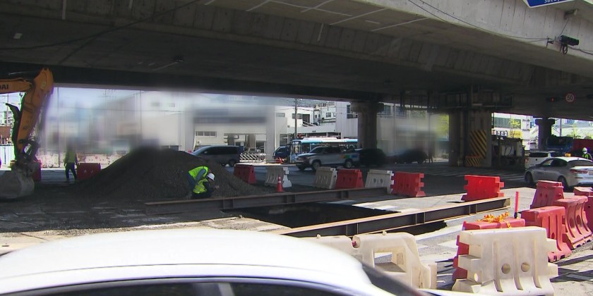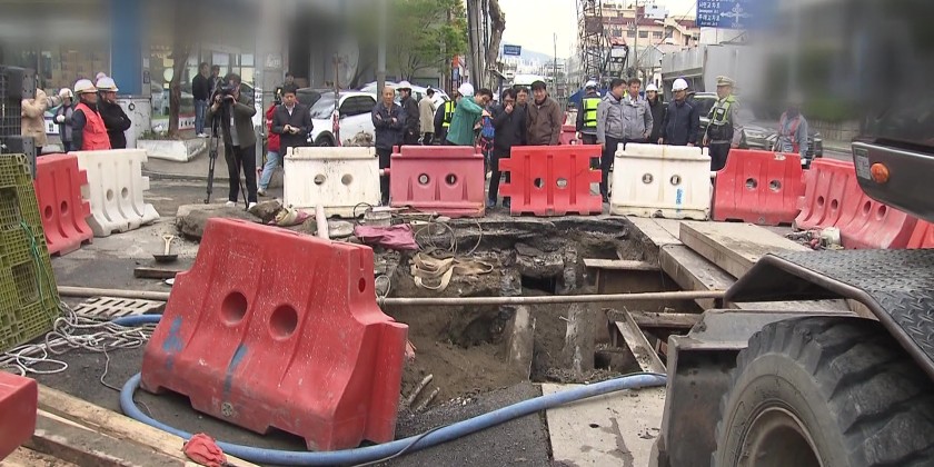 Another large sinkhole has appeared near a subway construction site in Busan for two consecutive days. As there are over 10 sinkholes near the construction site alone, residents are growing nervous. One side of a road gradually sinks and a hole suddenly opens up.