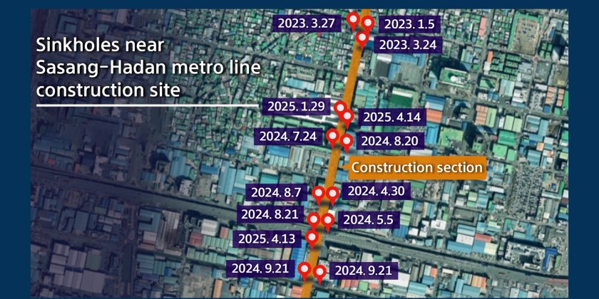 At around 7 a.m. Monday, a two-meter-deep sinkhole with a diameter of three meters emerged in Sasang-gu District in Busan. The site is only 200 meters from a major sinkhole that opened just a day before. The city government said areas around the metro line construction are under special oversight but is not disclosing a ground subsidence risk map, citing concerns over property rights violation.