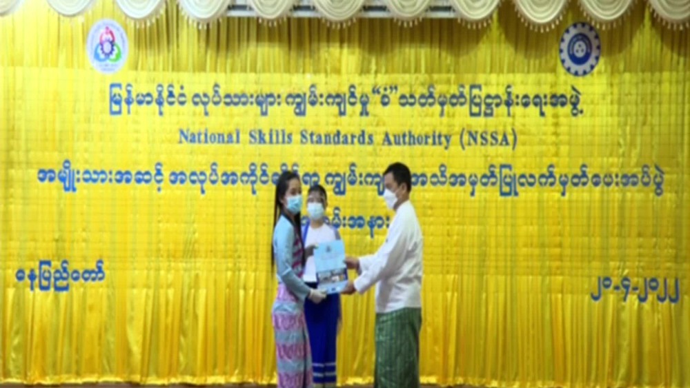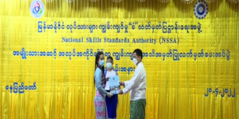 National Skills Standards Authority-NSSA presented the recognition certificates to over 500 workers on Wednesday. Chairman of the Central Committee for Employment and Skills Development, Union Minister for Labour U Myint Kyaing attended the ceremony and made a speech.