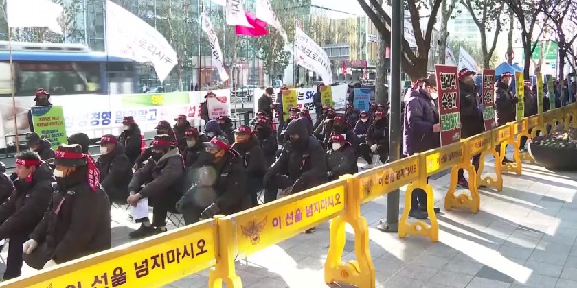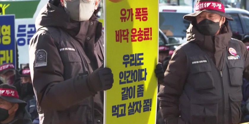 South Korean cargo truck drivers' strike continued on Wednesday despite the executive return-to-work order.Dozens of unionized truckers staged protests outside the office buildings of Hyundai Oil Bank and SK Energy amid the government's pressures on the cargo workers.