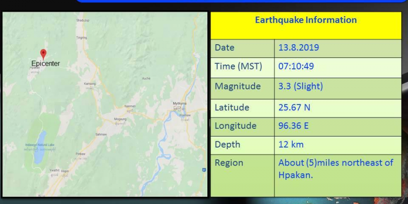 The slight earthquake in Kachin State with a depth of 12 kilometers occurred at 7 hrs 10 minutes 49 seconds Myanmar Standard Time.