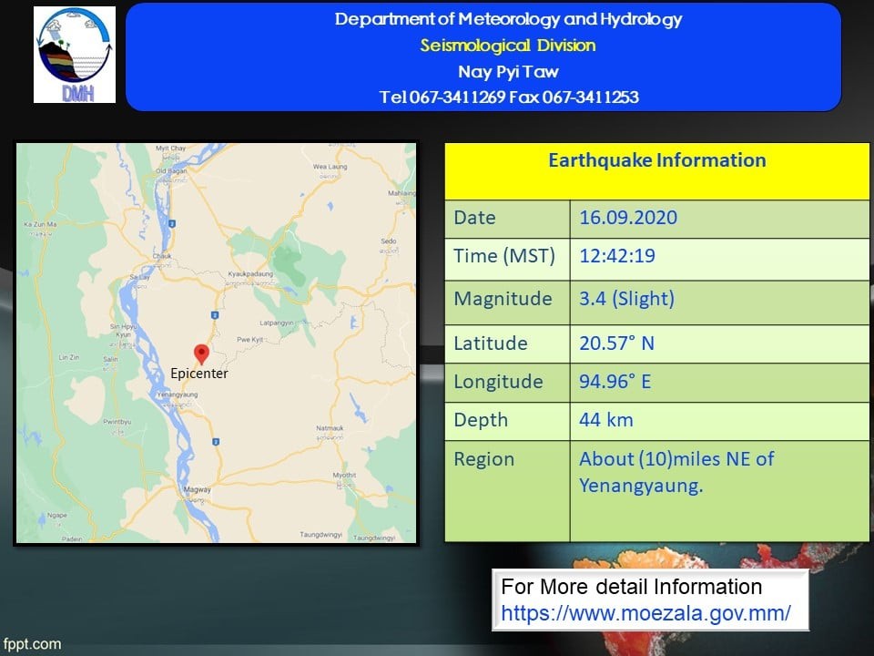 The slight earthquake in Magway Region with a depth of 44 kilometers occurred at about 12:42 p.m. Myanmar Standard Time.