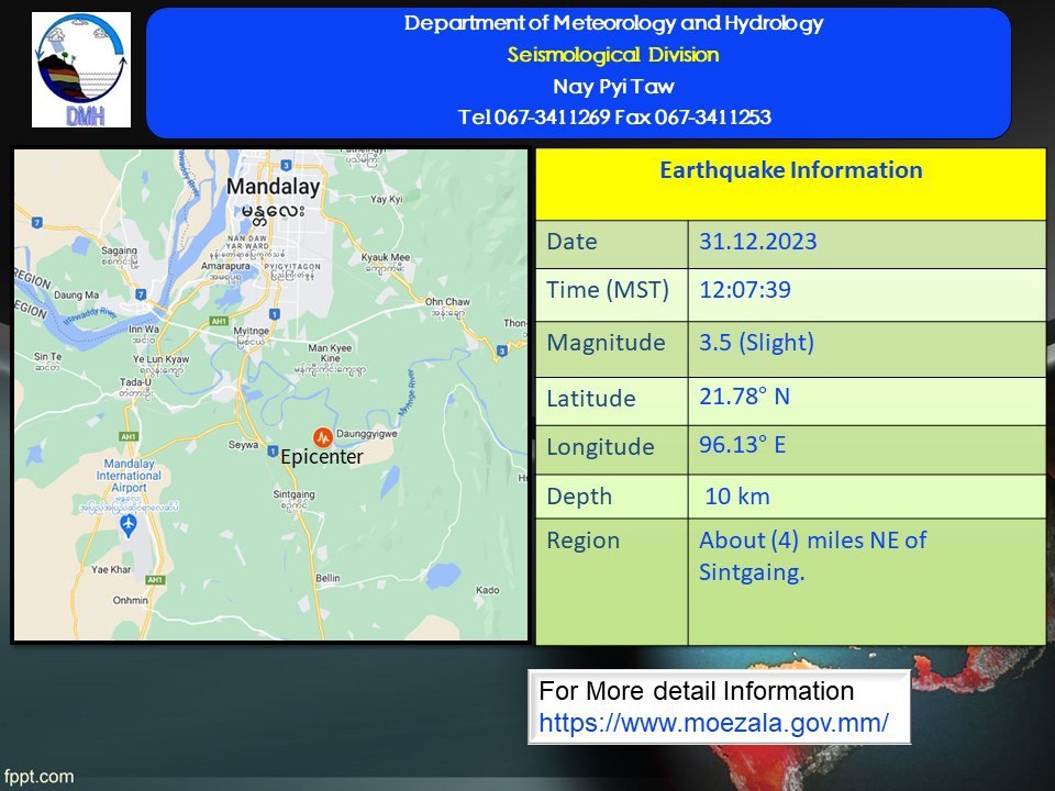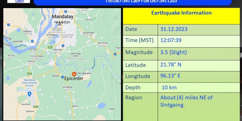 A 3.5-magnitude earthquake hit about 4 miles northeast of Sintgaing Township on Sunday, according to the Department of Meteorology and Hydrology. The slight earthquake in Mandalay Region with a depth of 10 kilometers occurred at about 12:07 p.m. Myanmar Standard Time.