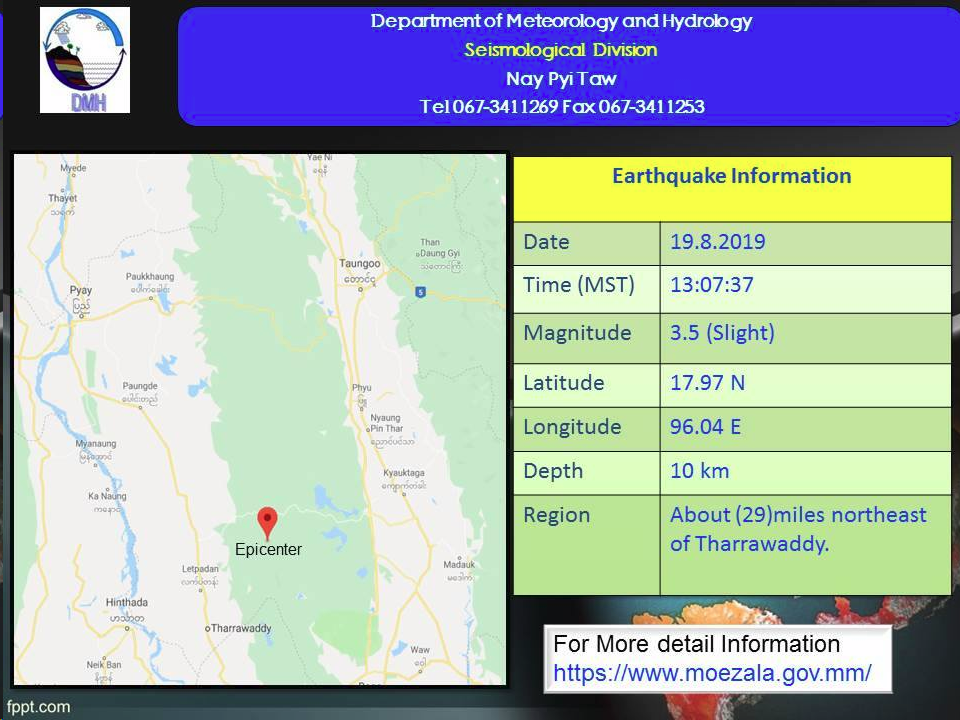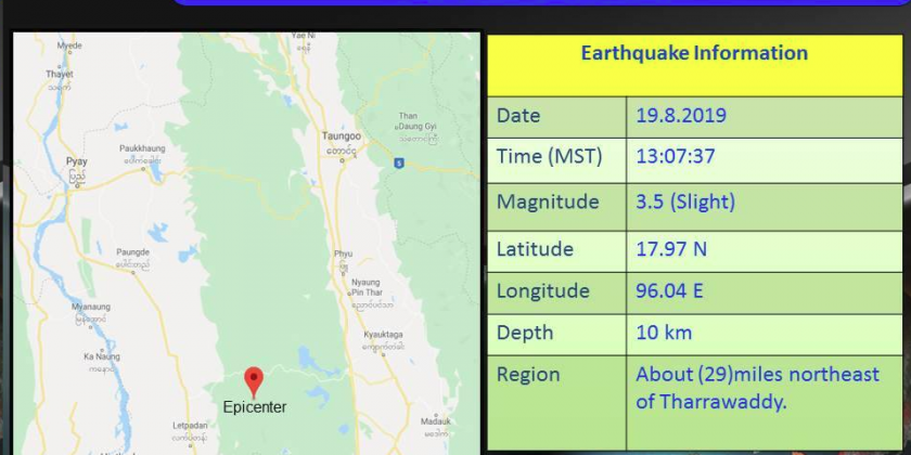 A 3.5-magnitude earthquake hit with its epicenter about 29 miles northeast of Tharrawaddy Township on Monday afternoon, according to the Department of Meteorology and Hydrology.