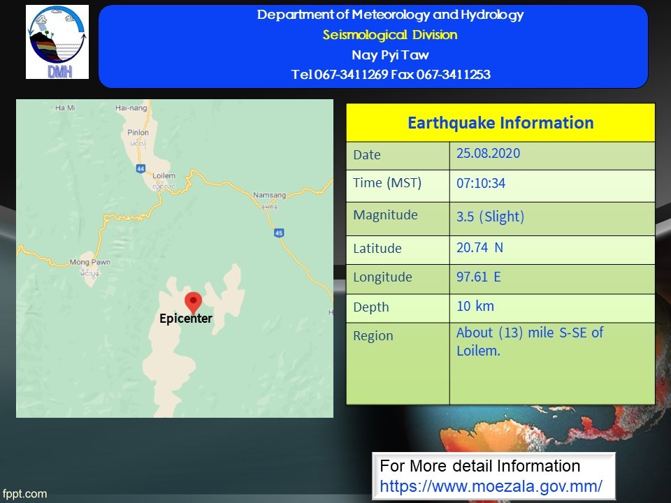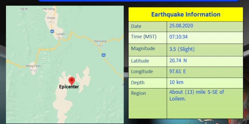 The slight earthquake in Shan State with a depth of 10 kilometers occurred at about 7:10 a.m. Myanmar Standard Time.