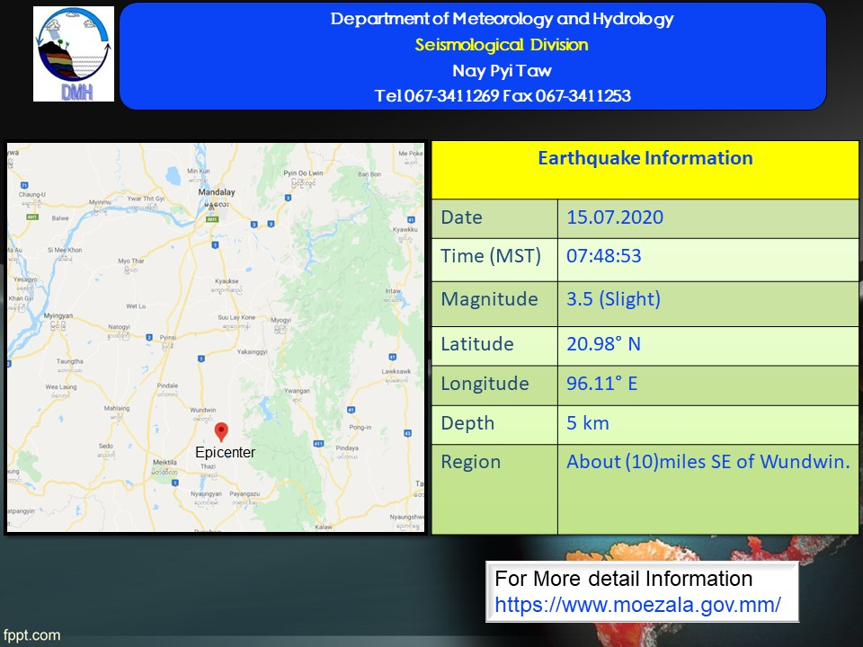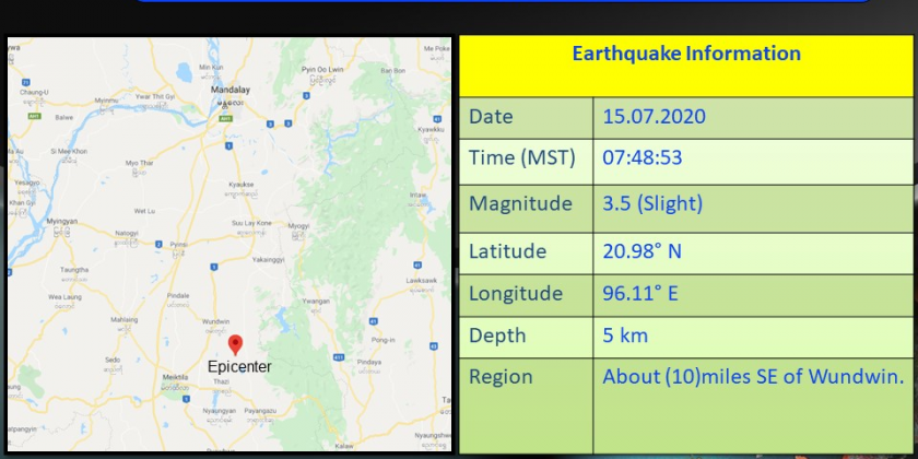 The slight earthquake in Mandalay Region with a depth of 5 kilometers occurred at about 7:48 a.m. Myanmar Standard Time.