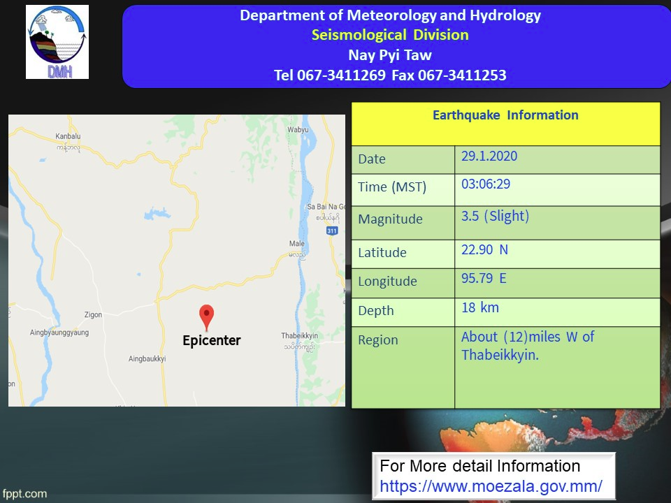 The slight earthquake in Mandalay Region with a depth of 18 kilometers occurred at 3 hrs 6 minutes 29 seconds Myanmar Standard Time.